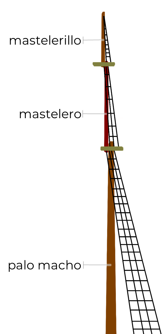 Por supuesto, para no confundirse, cada sección lleva de “apellido” el nombre del mástil al que corresponde, por ejemplo, palo macho de mayor, mastelero de mesana o mastelerillo de trinquete.
