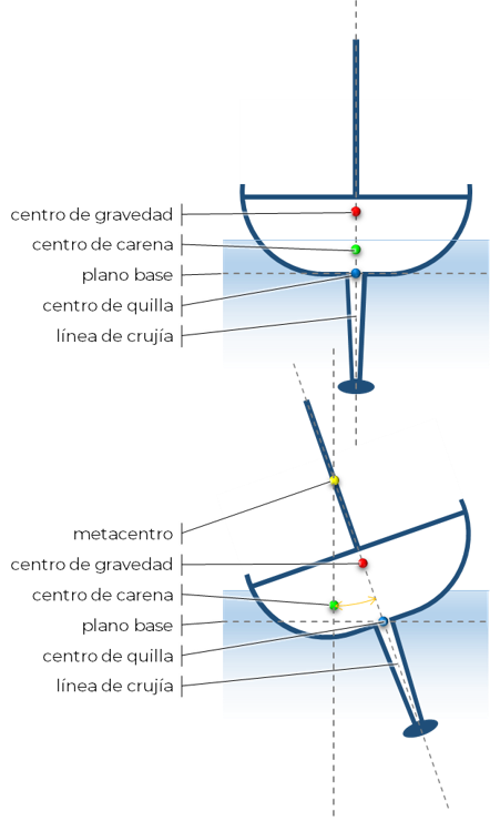 De acuerdo con lo que hemos explicado, si un velero está adrizado, el centro de gravedad y el centro de carena coincidirán con el plano de crujía, es decir que ambos centros estarán ubicados sobre el mismo plano vertical, pero no necesariamente en el mismo punto de ese plano.