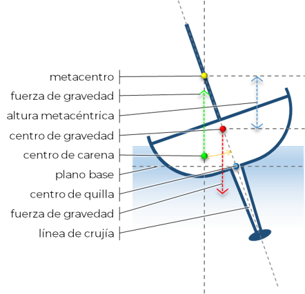 ° | El metacentro es el punto en el que se cruzan el plano de crujía y la vertical del centro de carena cuando este se mueve producto de la escora del barco, o de otros movimientos como los rolidos y cabeceos. |
